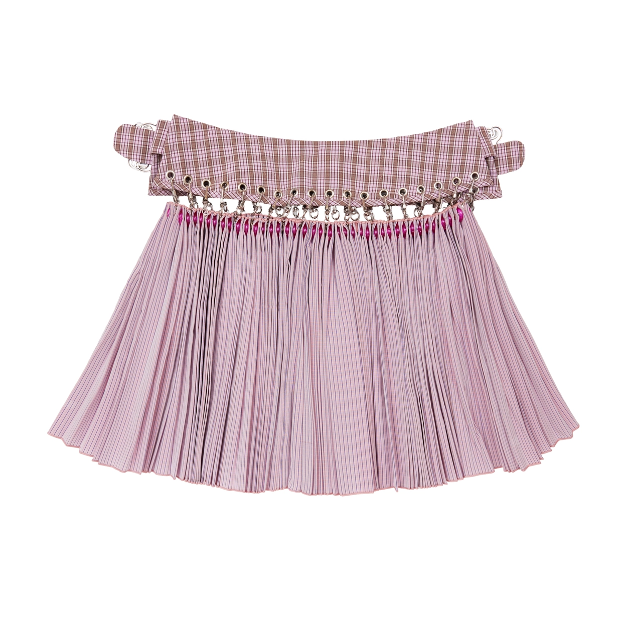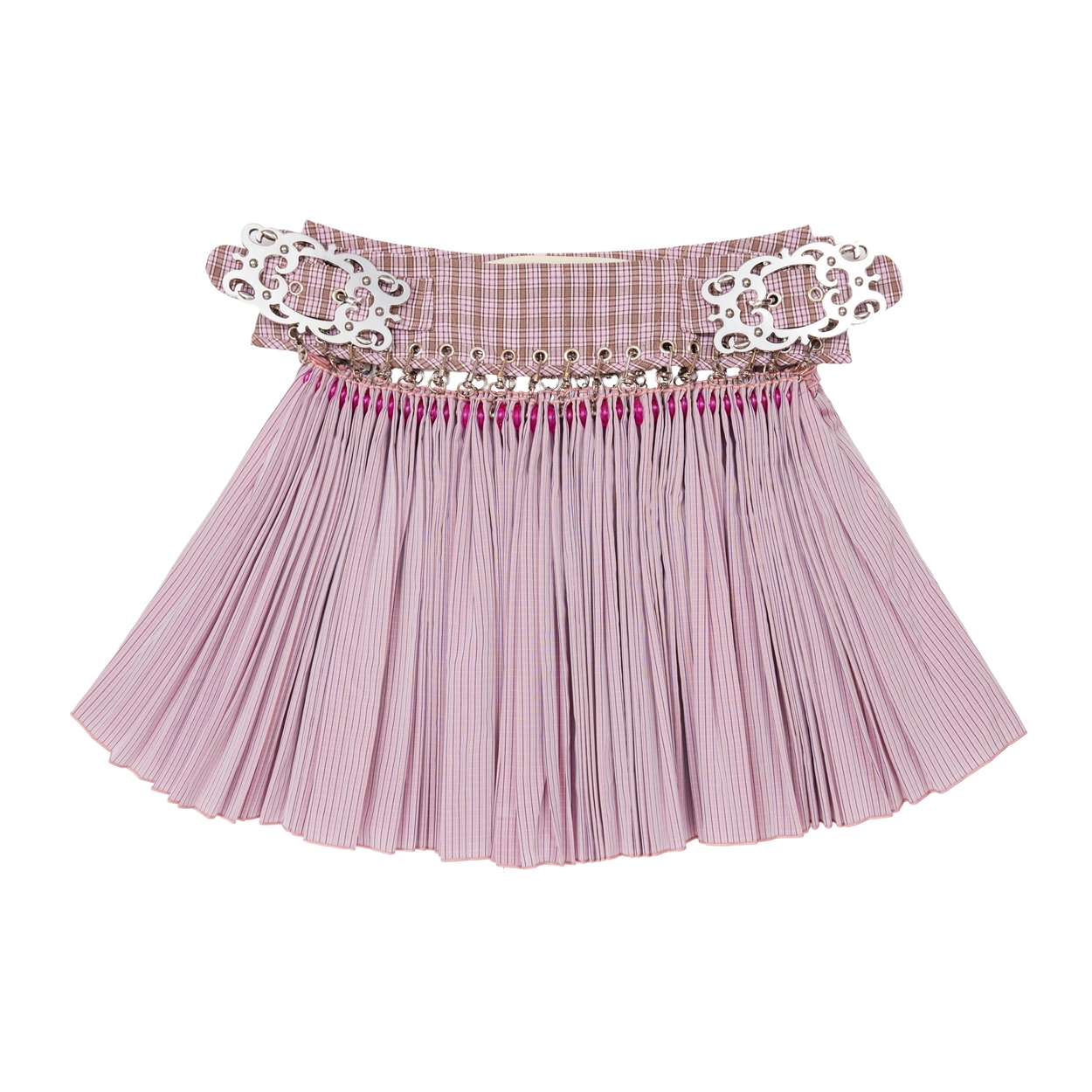 전통적인 플리츠 스커트, 수공예 디테일, 하드웨어 요소를 현대적인 실루엣으로 재해석하며, 강렬하면서도 유머러스한 스타일을 선보입니다.