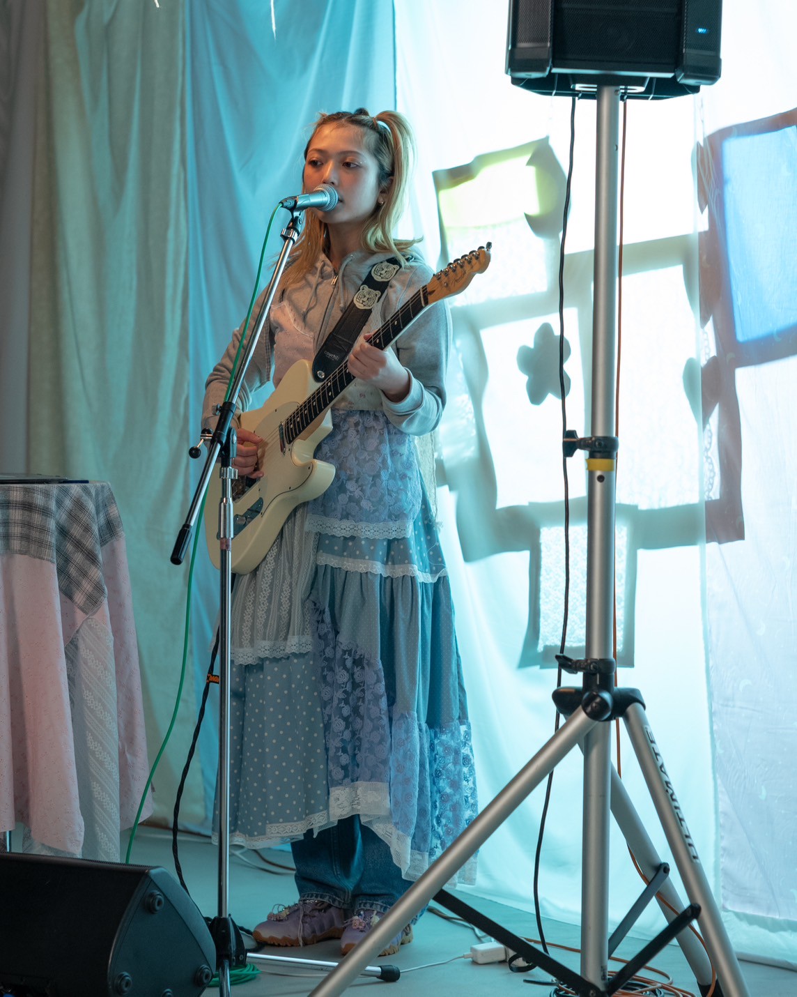 - 겹쳐 입은 듯한 느낌의 레이스와 플라워 패턴을 패치워크한 후디